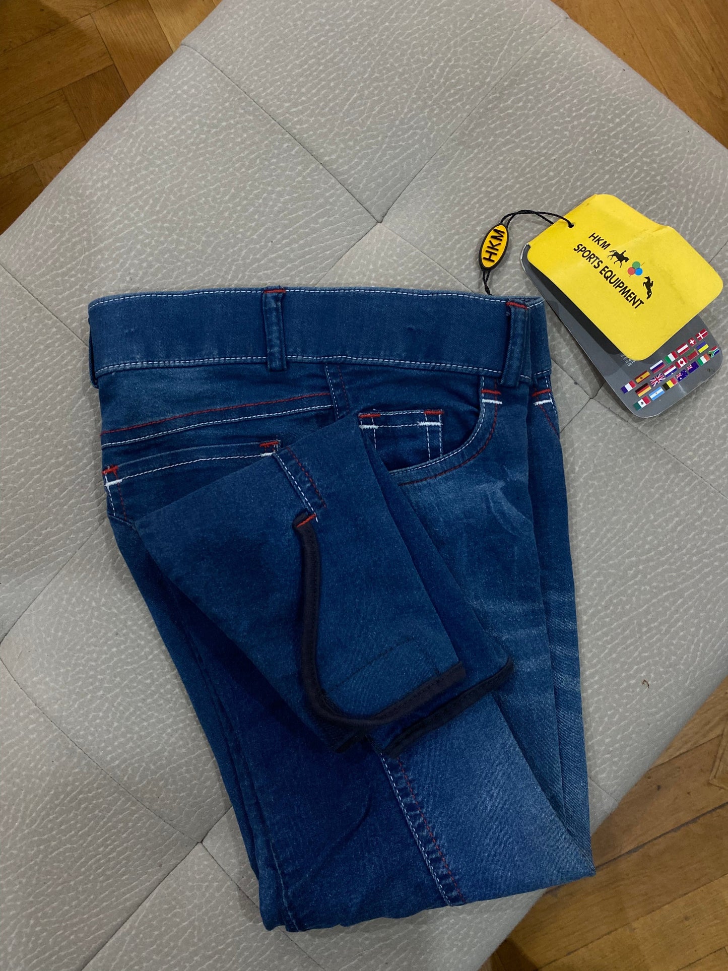 Girls' riding jeans made from stretch fabric for maximum comfort during exercise. The 95% cotton and 5% elastane blend ensures durability and freedom of movement. They feature an internal Alcantara gripper for a firm grip on the saddle, two front pockets, belt loops, and two back pockets. The elasticated ankle closure offers a precise fit. Easy to care for: machine washable at 30°C and tumble dryable.