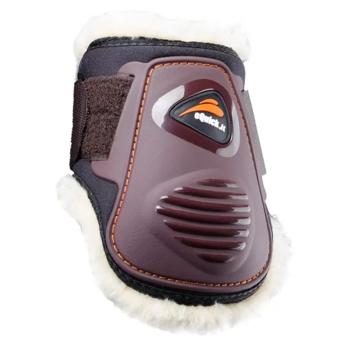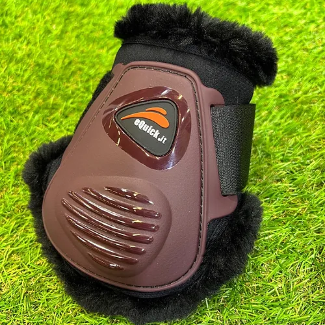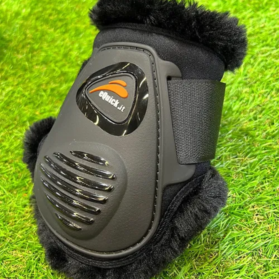 Neoprene and Lycra fetlock protectors, TPU shell reinforced with an exclusive treatment that makes them similar to leather, equipped with double velcro. Soft artificial lambskin inside