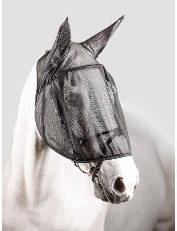 Fabricada en malla suave, esta máscara es especialmente adecuada para proteger al caballo de los insectos, tanto durante el trabajo como durante el descanso.