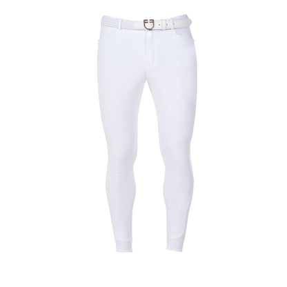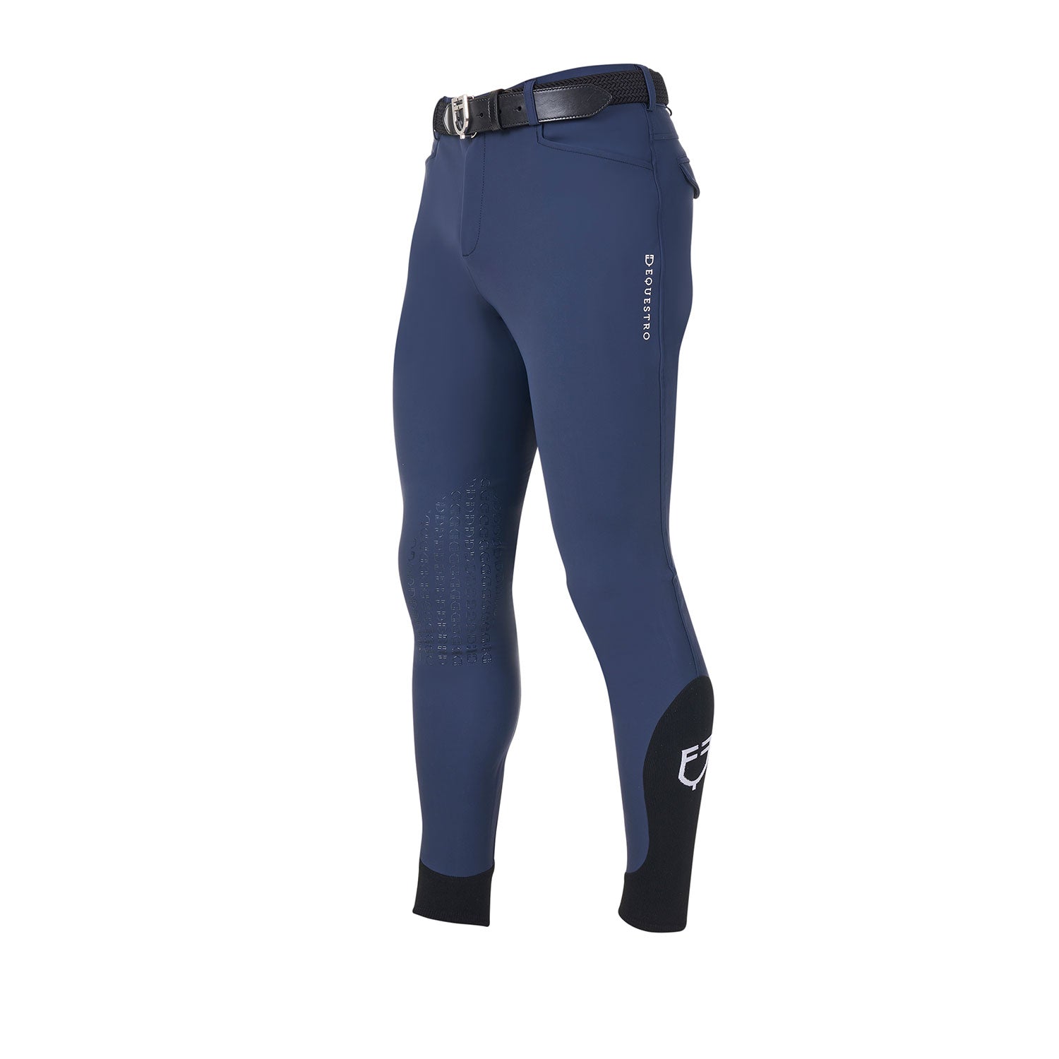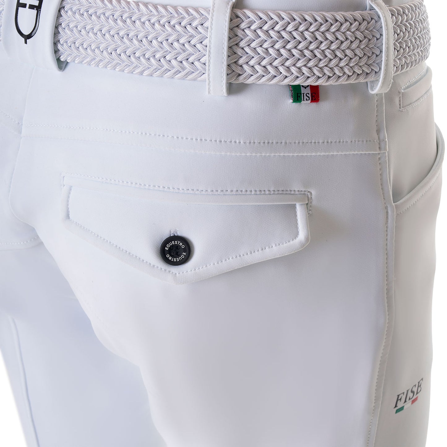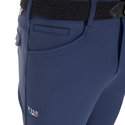 Pantalón de hombre Equestro X FISE slim fit, en tejido técnico bielástico y transpirable de última generación, con inserciones de lycra en la base del tobillo para garantizar practicidad en el calce.