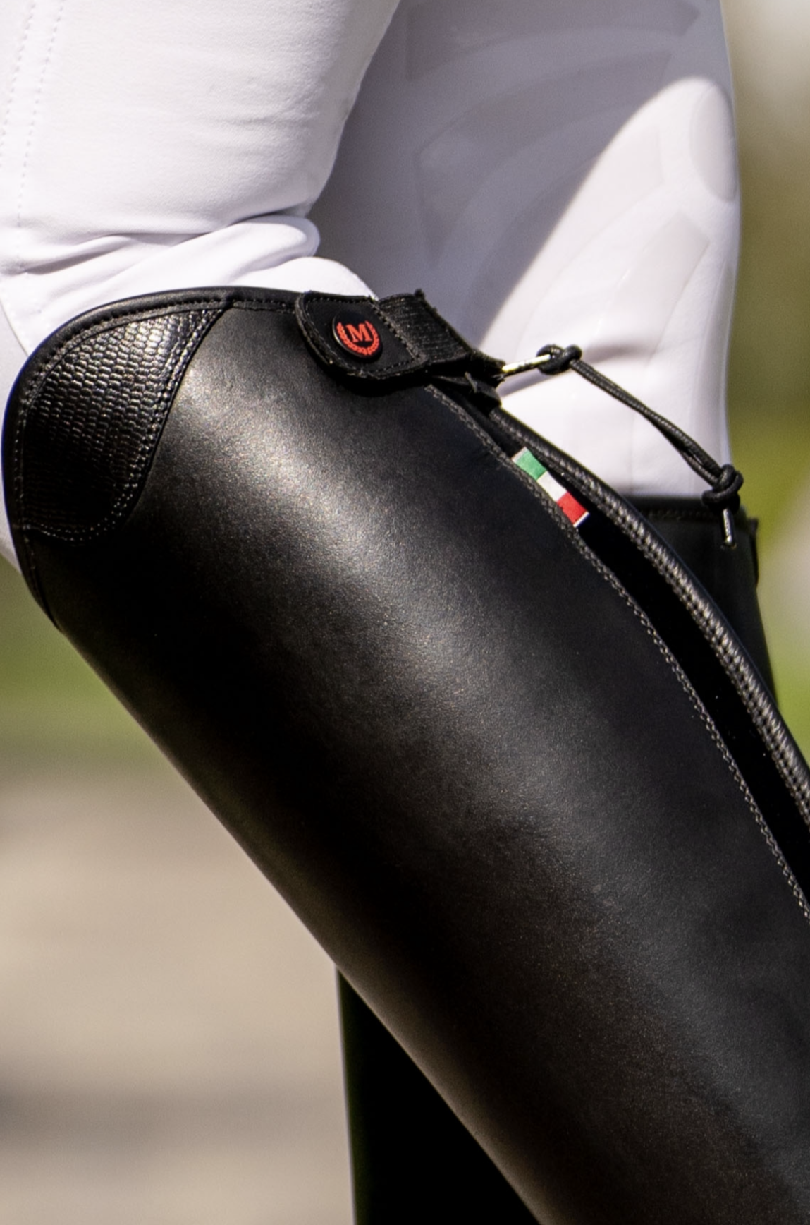 Suela Eva-light en compuesto de caucho suave no absorbente, banda elástica recubierta de Lycra en la parte trasera para una mejor adherencia a la pantorrilla, cierre de cremallera de piel en la parte superior, espolón protegido y bloqueador de espolón lateral.