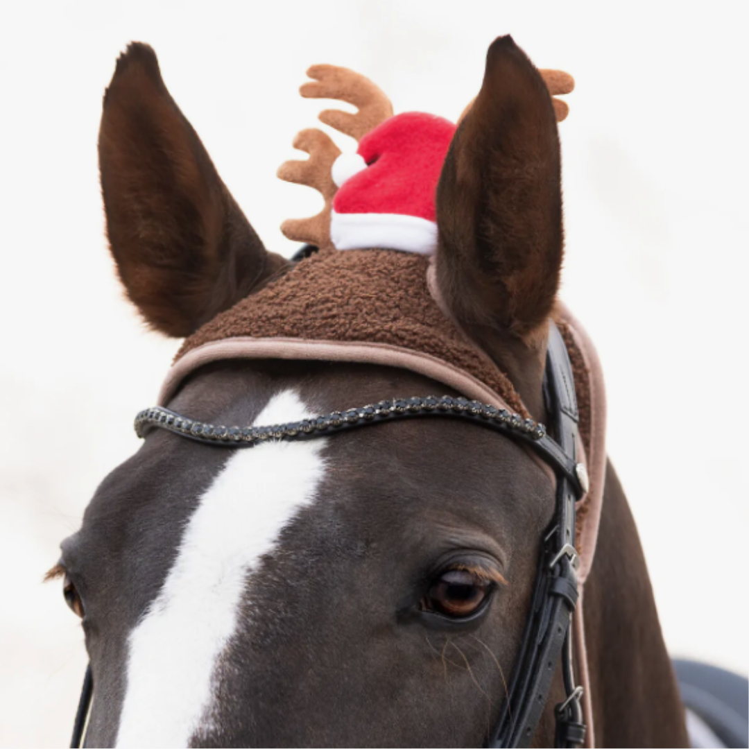 - Cuffia per le orecchie per il periodo più divertente dell'anno! La rete per le orecchie ha un cappello natalizio e corna di renna. Le orecchie del tuo cavallo o pony possono facilmente passare attraverso i fori. Puoi attaccare le corde intorno alla gola del cavallo.