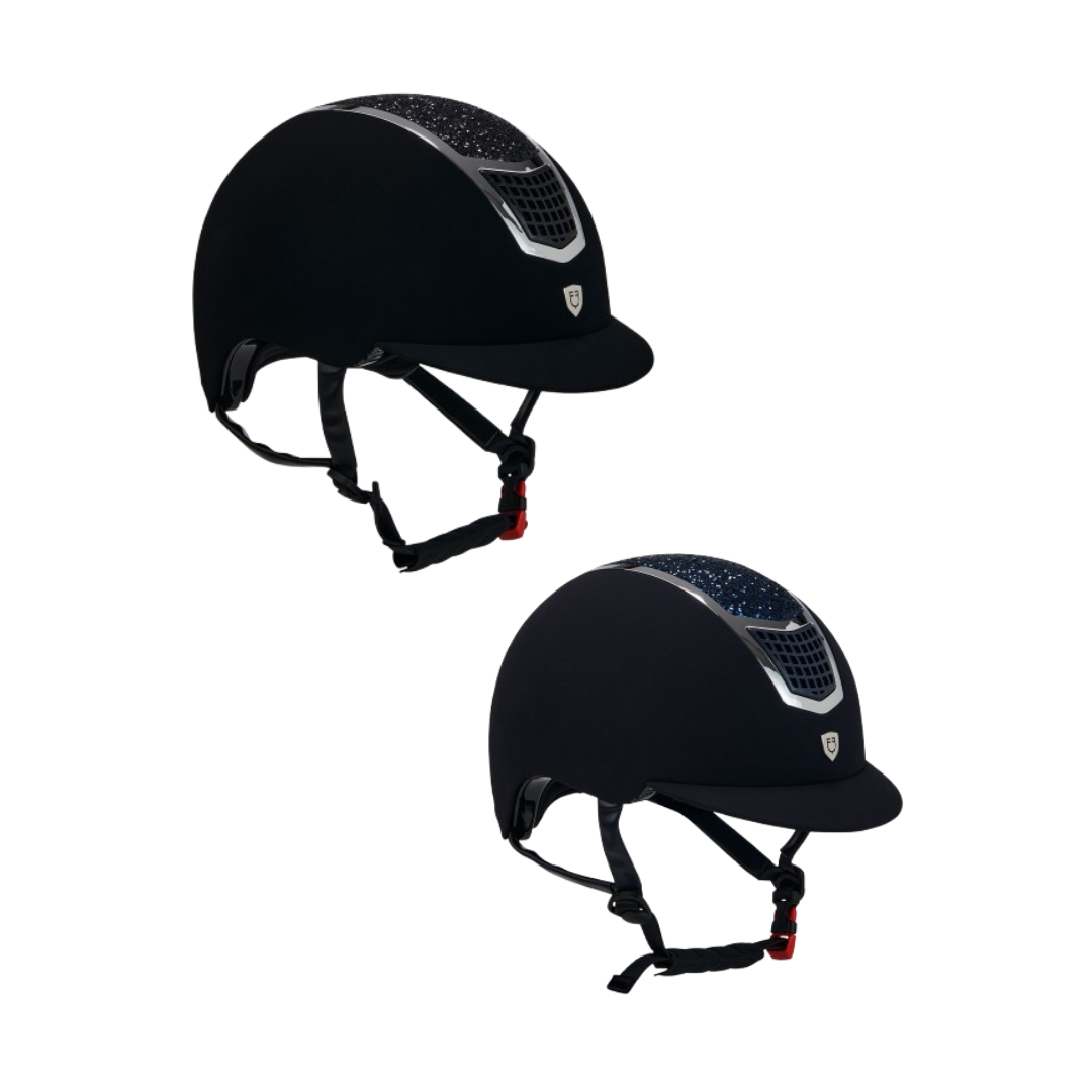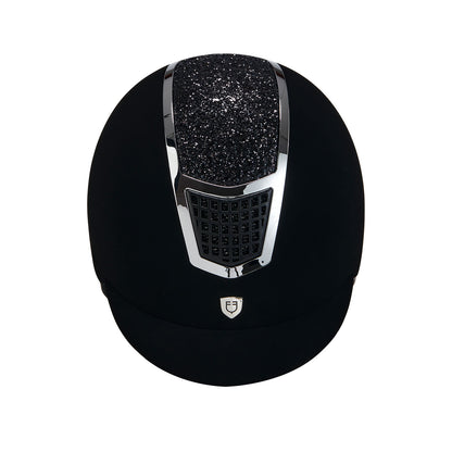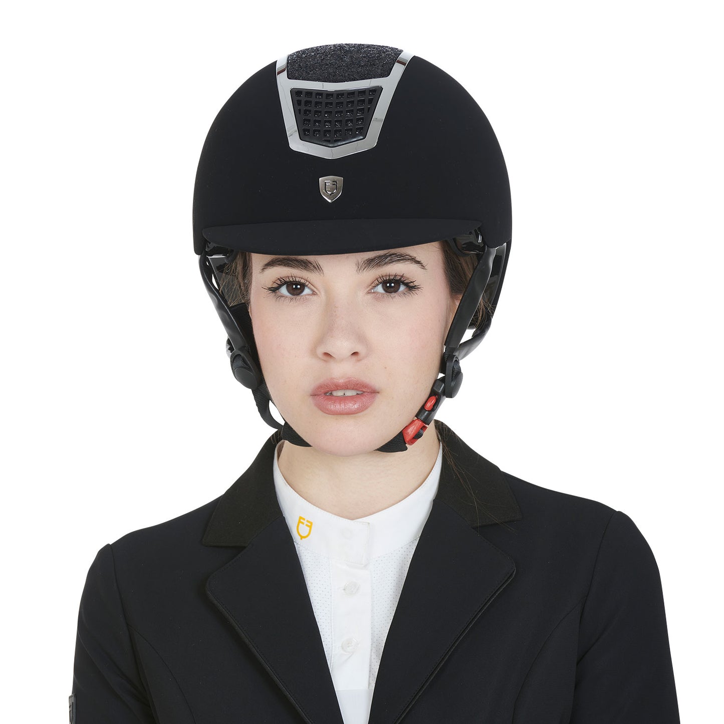 La calotta esterna è in velluto con prese d’aria frontali decorate con applicazioni di strass, profili lucidi e targhetta con logo Equestro per un design estremamente raffinato.