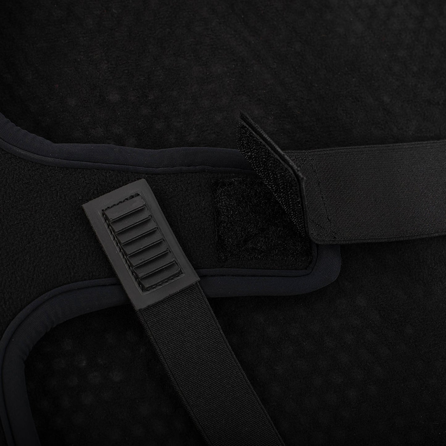 Dotato di una cinghia elastica che scorre lungo la parte inferiore della sella, il copriseggio si fissa saldamente ai cuscini, senza compromettere l'assetto naturale della sella. Inoltre, i cinturini con grip posizionati sulle parti laterali si agganciano alla parte interna dei cuscini della sella, offrendo una stabilità superiore senza interferire con le posizioni abituali.