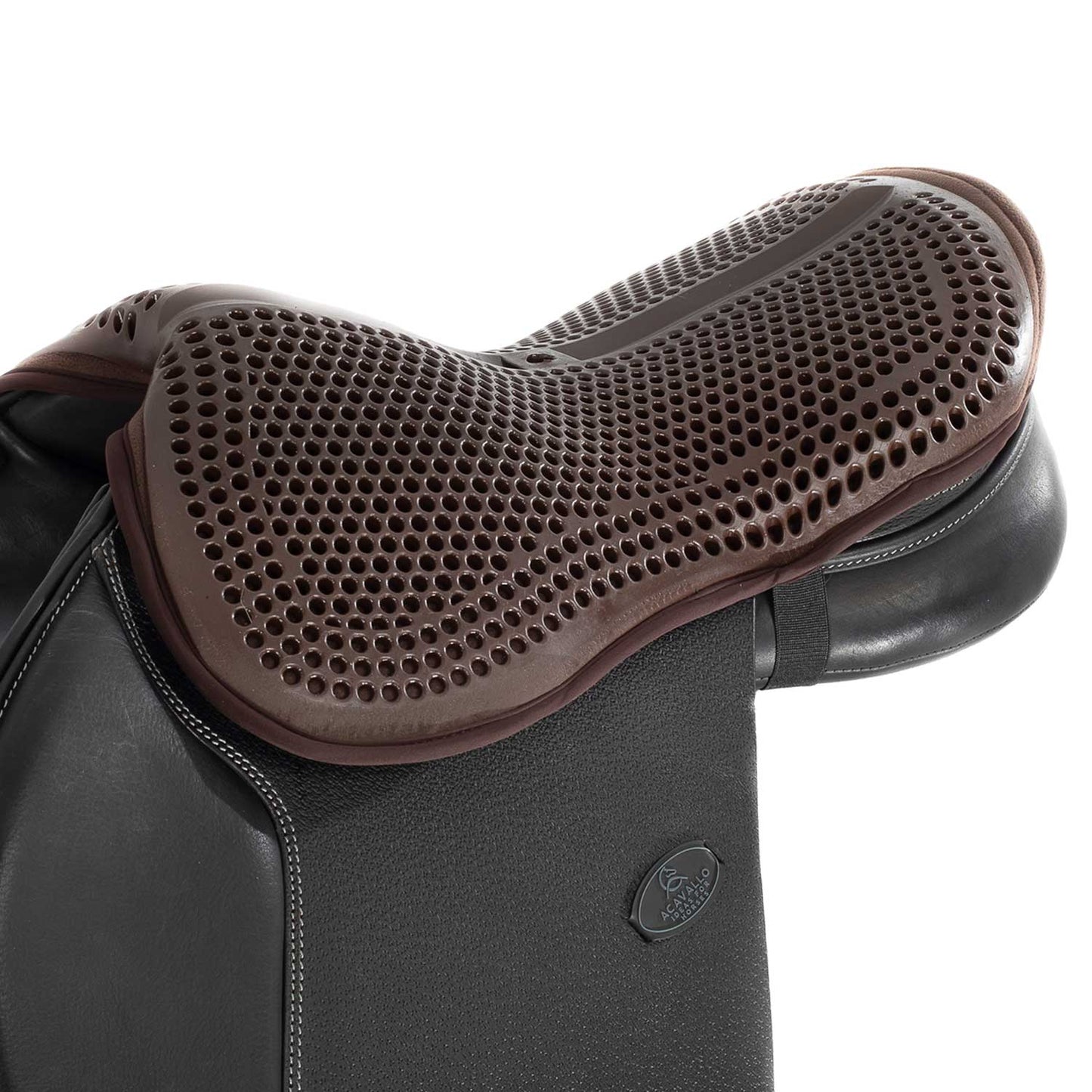 Nelle due parti laterali, il copriseggio, è dotato di due cinturini con grip che si agganciano sulla parte interna dei cuscini della sella, senza intaccare le normali posizioni degli stessi. Il sistema di aggancio permette così di non modificare l’assetto originale della sella, fornendo al contempo il tipico design elegante dei prodotti Acavallo®.