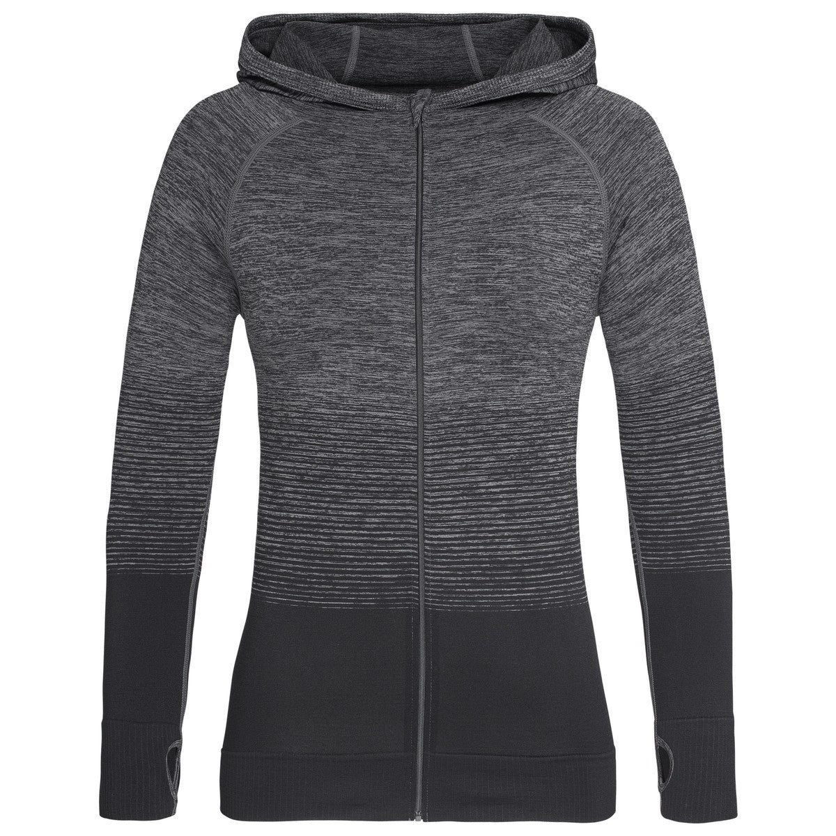 - Questa giacca da donna elasticizzata e resistente con cappuccio, cerniera protettiva al mento, maniche raglan, fori per pollici e sfumature multicolor con vestibilità aderente.