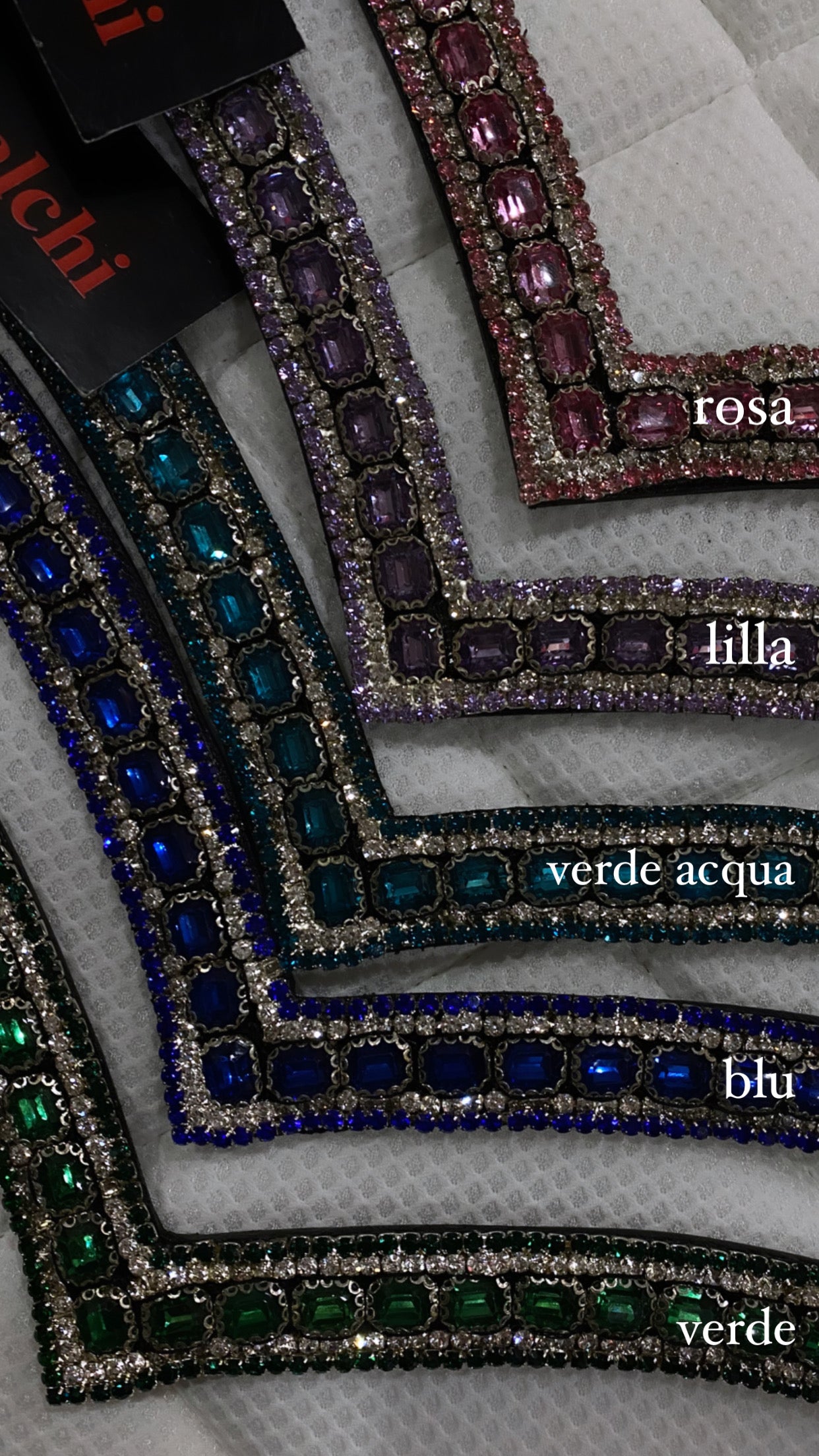 Frontalino in pelle conciata al vegetale rivestito con preziosi cristalli grandi.