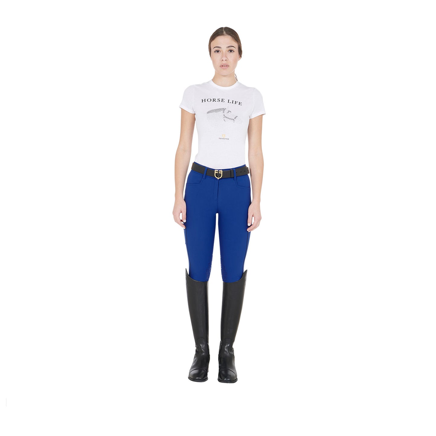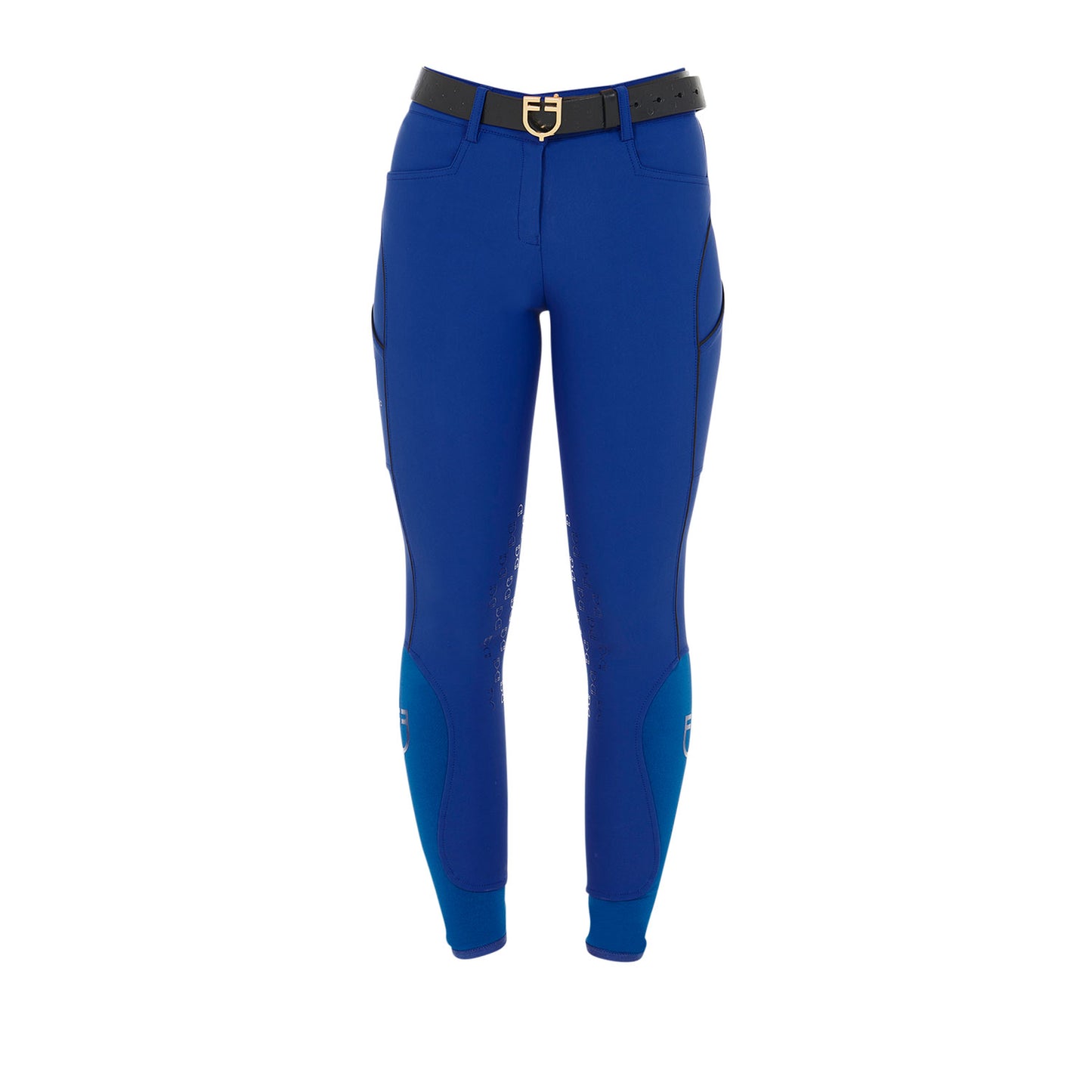 I pantaloni sono dotati inoltre di pratiche tasche frontali e laterali.La presenza di decorazioni in piping a contrasto lungo le cuciture, rende il capo elegante, in pieno stile Equestro.