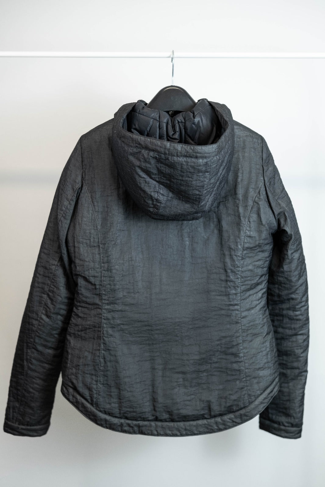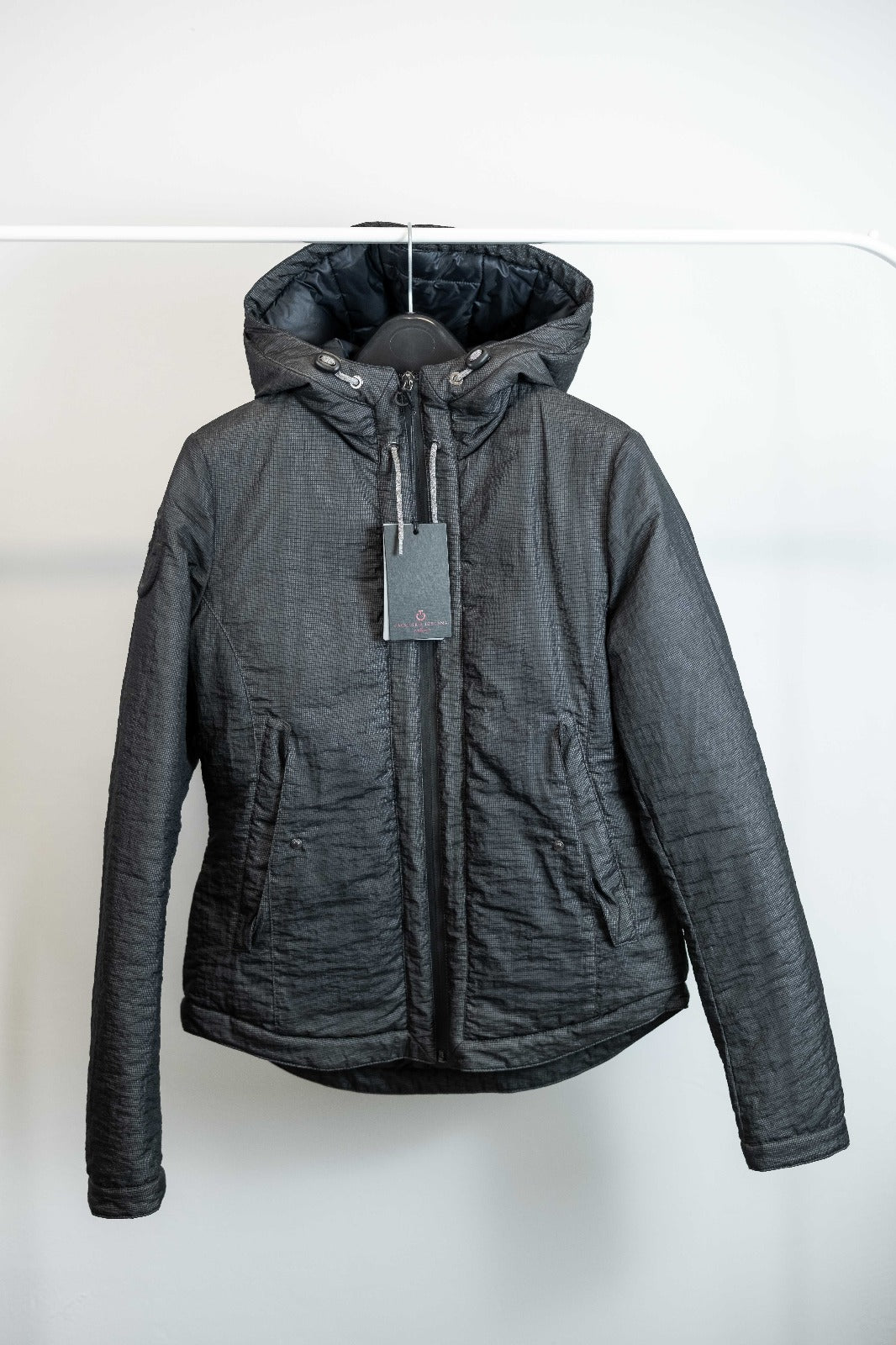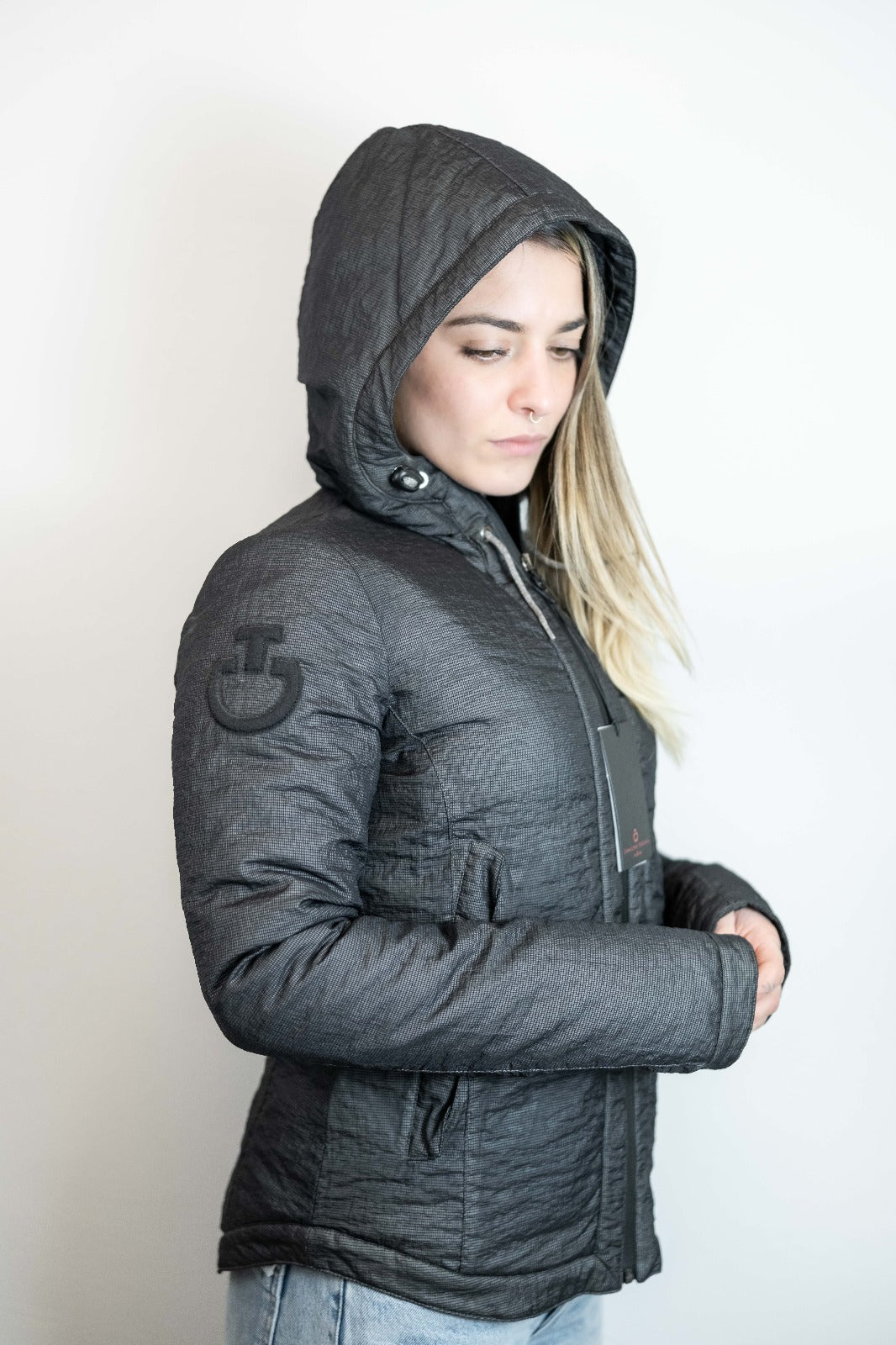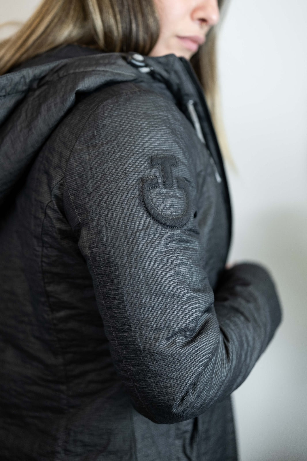 Piumino da donna, ideale per l'equitazione, realizzato in tessuto tecnico, antibatterico, anti UV, traspirante e con imbottitura che richiama l'effetto della rete. La trama leggera e traspirante conferisce alla giacca un aspetto dinamico e contemporaneo, con un tocco di originalità.